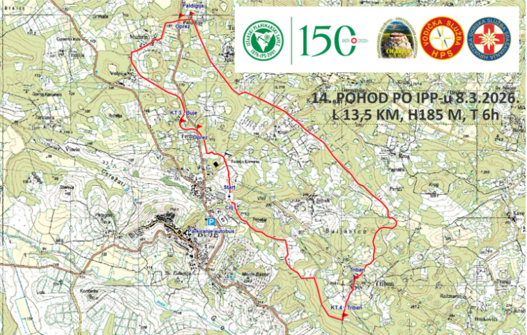 Pozivamo vas na sudjelovanje na 14. pohodu po Istarskom planinarskom putu u organizaciji Istarskog planinarskog saveza. Na ovom će se pohodu pješačiti rutom Buje (parkiralište poduzeća Feroplast) – IPP KT3 Buje – selo Volpija – selo Montrin – selo Paldigija – Buje naselje Kruj – Triban – KT4 Triban – IPP – Buje.
