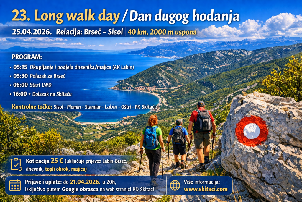 Jedan od najprepoznatljivijih planinarskih događaja u Istri vraća se i ove godine. U subotu, 25. travnja 2026., održava se 23. izdanje Long Walk Day-a, tradicionalnog pohoda PD Skitaci koji okuplja planinare, rekreativce i zaljubljenike u prirodu iz cijele regije, a i šire.
